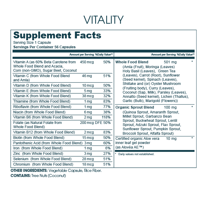 A unique blend of some nature’s nutrient-dense foods, plants, sprouts and immune optimizing Acemannan. This amazing breakthrough composition provides nutritionally effective levels of whole-food sourced vitamins, minerals, digestive enzymes and trace elements in their most bio-available form for the production and maintenance of healthy cells and an optimally functioning metabolism.*